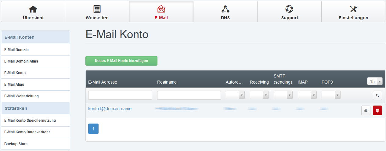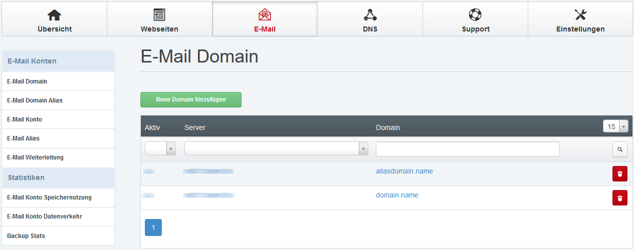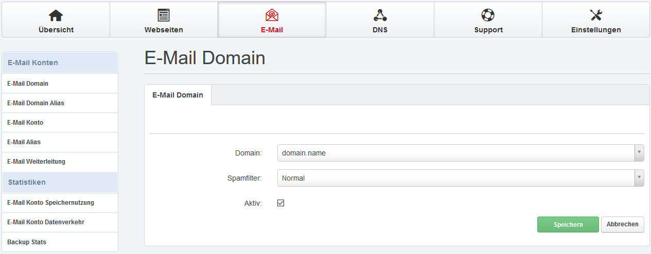 Um ein E-Mail Konto, E-Mail Alias, E-Mail Domain Alias oder eine E-Mail Weiterleitung einrichten zu können, muss die Domain als E-Mail Domain hinzugefügt worden sein.