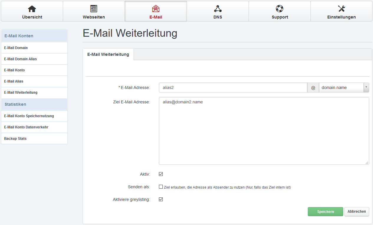 Mit Aktiviere Greylisting wird für diese Weiterleitungsadresse das Greylisting aktiviert, sofern als Tarif Option gebucht.
