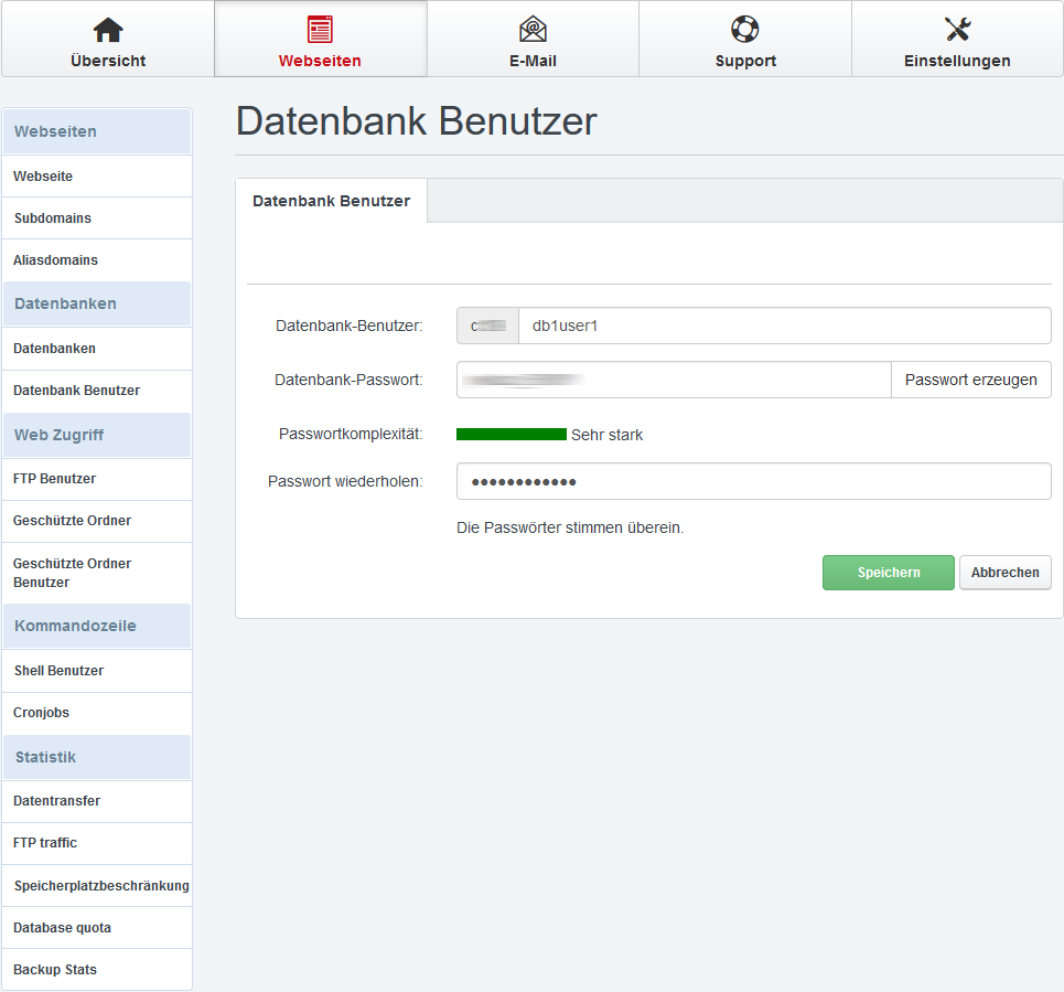 Datenbank Passwort: Erzeugen Sie ein sehr starkes Datenbank Passwort mit Passwort erzeugen und notieren Sie es sofort.